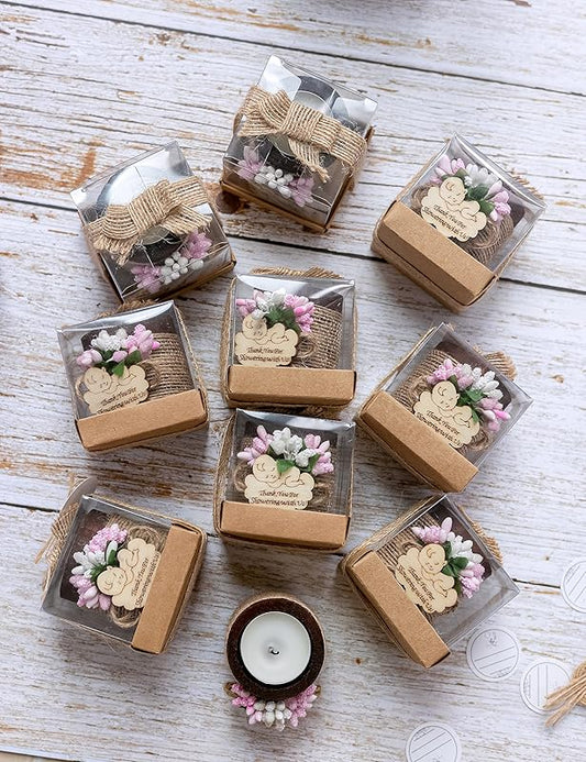 10 Handmade Wooden Tealight Candle Holders, Baptism Gifts, Baby Shower Party Favors for Guests, Gender Reveal Party Gifts, with Personalized Tags, Baby Girl gender reveal. (dark brown-pink)