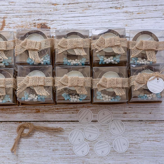 10 Handmade Wooden Tealight Candle Holders, Baby Shower Party Favors for Guests, Gender Reveal Party Gifts, with Personalized Tags, Baby Boy Gender Reveal. (dark brown-blue)
