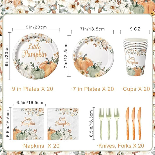 100 Pcs Little Pumpkin Baby Shower Party Decoration – Autumn Pumpkin & Floral Tableware Set with Plates, Napkins, Cups, Cutlery for Thanksgiving & Fall Baby Shower Decorations, Serves 20