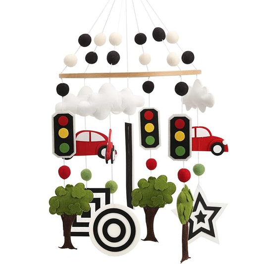 High Contrast Mobile - Black and White Crib Mobile for Development with red Cars, Green Trees and Black and White Patterns