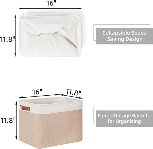 HNZIGE Fabric Storage Baskets for Organizing [2 Pack] Large Canvas Rectangular Storage Bins for shelves 16" X 11.8" X 11.8" Clothes Baskets Collapsible Bins for Closet Linen Organizers (Beige&White)