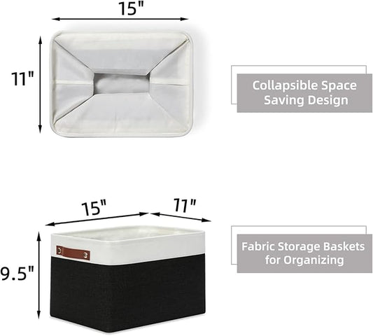 HNZIGE Large Storage Baskets (3 Pack) - Fabric Bins with Leather Handles, Foldable for Organizing Clothes, Toys (Black & White, 15" x 11" x 9.5")