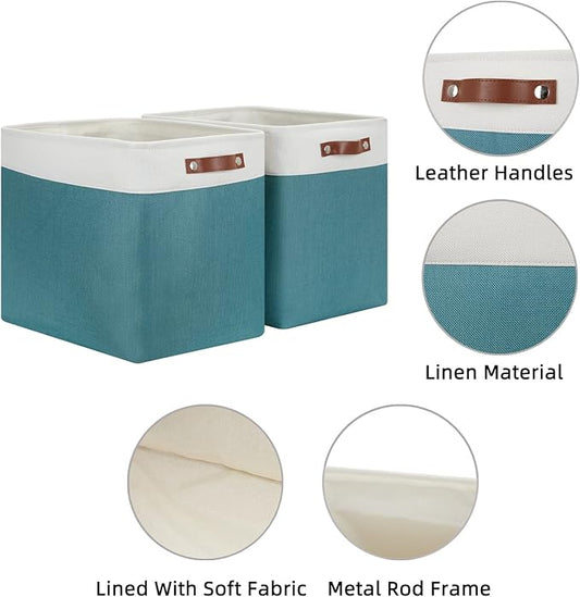 HNZIGE Foldable Storage Cubes & Baskets (3 Pack) - 13 Inch Storage Bin with Leather Handles for Toys, Clothes, Kids, Closet (White & Teal)