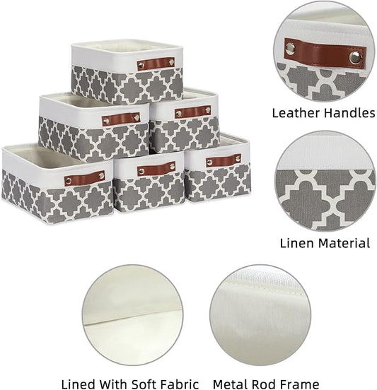 HNZIGE Small Organizer Bins for Shelf,Small Fabric Collapsible Baskets for Organizing Nursery Linen Canvas,Set of 6 Decorative Storage Basket for Storage Closet Toy(White&Gray, 11.8" x 7.8" x 5.1")