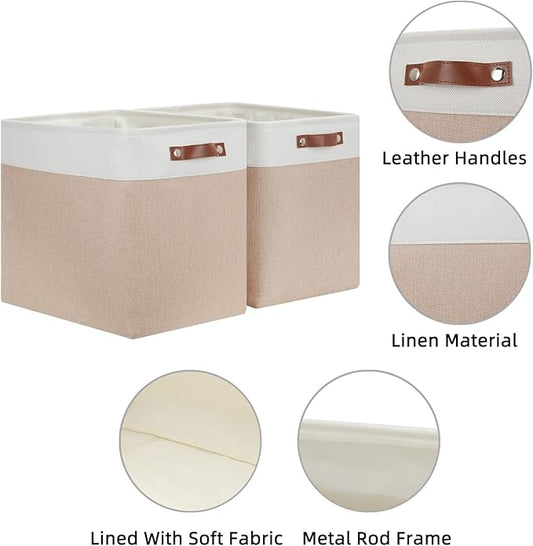 HNZIGE Cube Storage Baskets for Shelves Foldable Storage Baskets(3 Pack) Cube Storage Bin,13 Inch Storage Basket for Organizing with Leather Handles for Toys, Clothes, Kids, Closet (White&Beige)