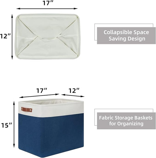 HNZIGE Storage Baskets for Organizing, Set of 2, Foldable Storage Bins Navy Blue Tall Baskets for Shelves, Canvas Collapsible Storage Bins with Handles for Storage Closet Linen(White Blue)