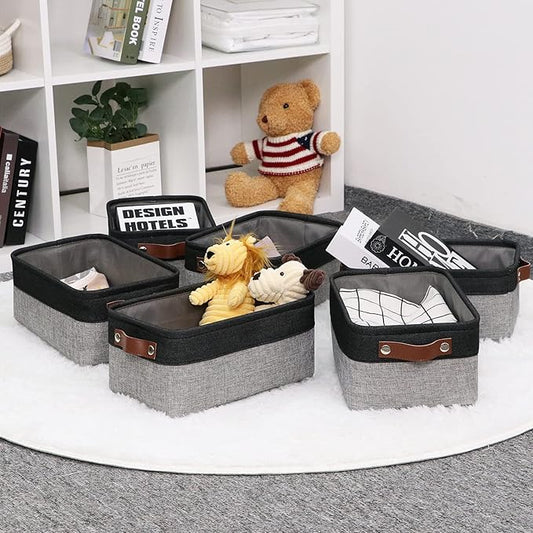 HNZIGE Small Storage Baskets Fabric Bins(6-Pack)Baskets for Shelves, Empty Gift baskets with Leather Handles,Folable Baskets for organizing Clothes, Toys, Books, Gifts(Black&Gray,11.8" x 7.8" x 5.1")