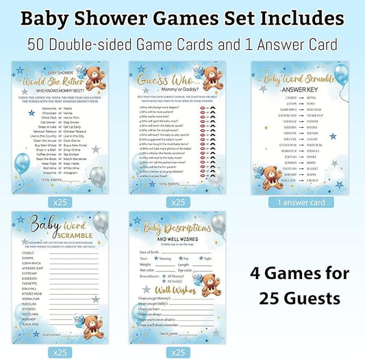 HOMANGA Baby Shower Games for Boy Girl, 4 Fun Games for 25 Guests, Who Knows Mommy Best, Guess Who Mommy or Daddy, Word Scramble, Baby's Descriptions & Well Wishes, Blue Bear Baby Showers Decorations
