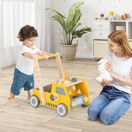 HONEY JOY Baby Push Walker, Adjustable Speed Baby Walker, Wooden Toy Tool Bench & Car Walker w/Shape Sorter, Develop Motor Skills & Creativity, Push Toys for Babies Learning to Walk, Gift, Yellow