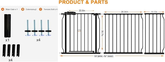 HOOEN 30" Tall Extra Wide Baby Gates for Doorways Stairs 76 to 86 in Large Long Pressure Mounted Pet Dog Gate Metal Tension Indoor Child Safety Gates with Extension Kits