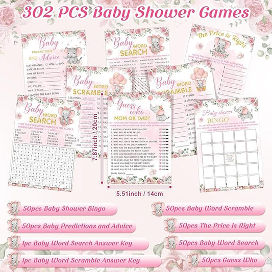 Jetec 302 Pcs Theme Baby Shower Games, 6 Games, 50 Sheets Each, Baby Shower Bingo, Baby Word Scramble, Baby Word Search, Baby Predictions and Advice, The Price is Right, Guess Who (Pink Elephant)