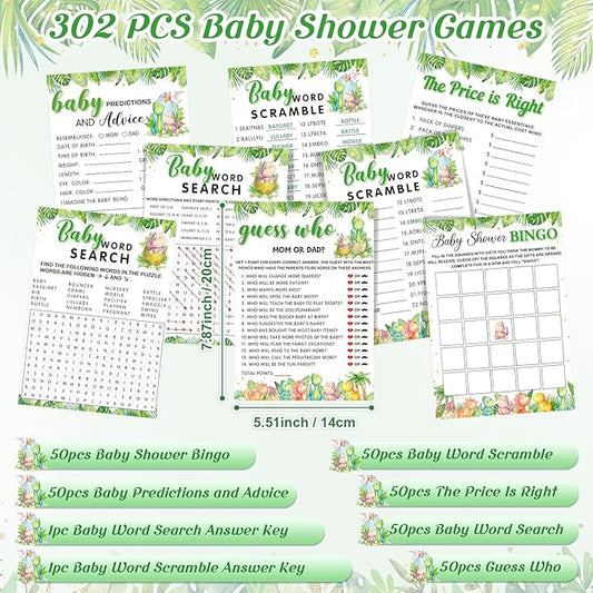 Jetec 302 Pcs Cute Dinosaur Theme Baby Shower Games, 6 Games, 50 Sheets Each, Shower Bingo, Word Scramble, Baby Word Search, Predictions and Advice, The Price is Right, Guess Who