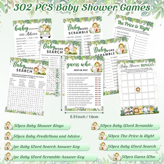 Jetec 302 Pcs Safari Animal Theme Baby Shower Games, 6 Games, 50 Sheets Each, Shower Party Bingo, Word Scramble, Baby Word Search, Predictions and Advice, The Price is Right, Guess Who
