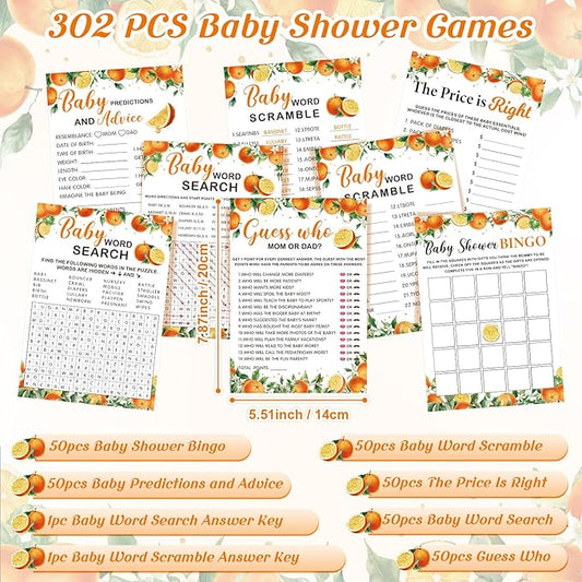 Jetec 302 Pcs Little Cutie Orange Theme Baby Shower Games, 6 Games, 50 Sheets Each, Shower Party Bingo, Word Scramble, Baby Word Search, Predictions and Advice, The Price is Right, Guess Who