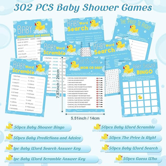 Jetec 302 Pcs Yellow Rubber Duck Theme Baby Shower Games, 6 Games, 50 Sheets Each - Baby Shower Bingo, Word Scramble, Word Search, Baby Predictions and Advice, The Price is Right, Guess Who