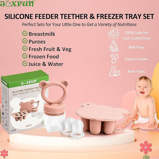 JEXFUN Baby Fruit Food Feeder & Mini Freezer Nibble Tray Combo, Breastmilk Popsicle Molds for Baby Cooling Relief, BPA Free Silicone Feeder for Safe Infant Self Feeding, 4 Month+ (Light Grey)
