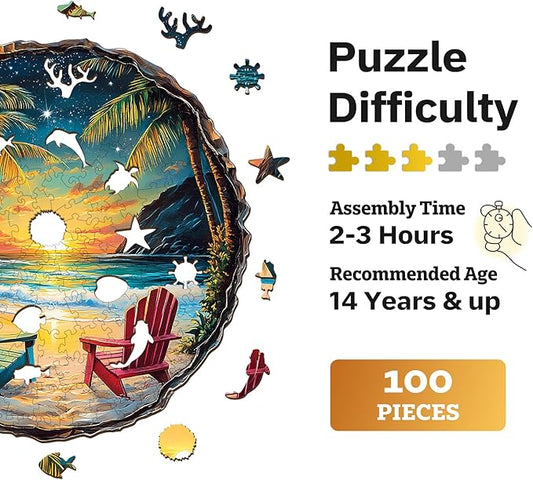 Jigfoxy Wooden Puzzle for Adults, Sunset Beach Wooden Jigsaw Puzzles for Adults, Unique Animal Shape Wood Cut Puzzles for Family Friend Puzzle Lovers(S-8.5 * 8.4in-100pcs)