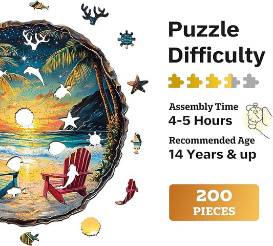 Jigfoxy Wooden Puzzle for Adults,Sunset Beach Wooden Jigsaw Puzzles for Adults, Unique Animal Shape Wood Cut Puzzles for Family Friend Puzzle Lovers(M-11.4 * 11.3in-200pcs)
