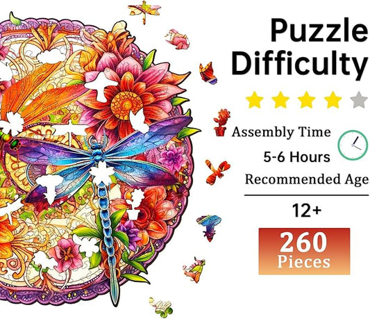 Jigfoxy Wooden Puzzles for Adults, Dragonflies Wood Puzzles Adult, Unique Animal Shape Wooden Jigsaw Puzzles for Adults, Birthday Gifts for Puzzle Lovers, Family, Friend (L-13.6 * 13.1in-260 pcs)