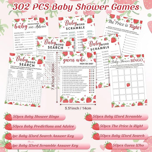 Jetec Strawberry Theme Baby Shower Games - 6 Games, 50 Sheets Each - Baby Shower Bingo, Word Scramble, Word Search, Predictions and Advice, The Price is Right, Guess Who