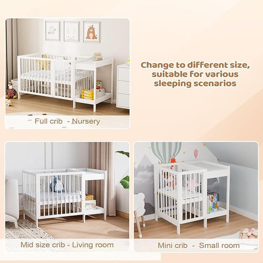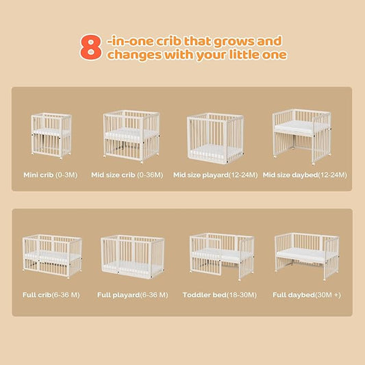 JOYMOR 8 in 1 Convertible Crib with Changer, Include 2” Mattress, Converts to Bassinet, Mid Crib, Full Size Crib, Daybed,Toddler Bed and Playard (Crib, White)