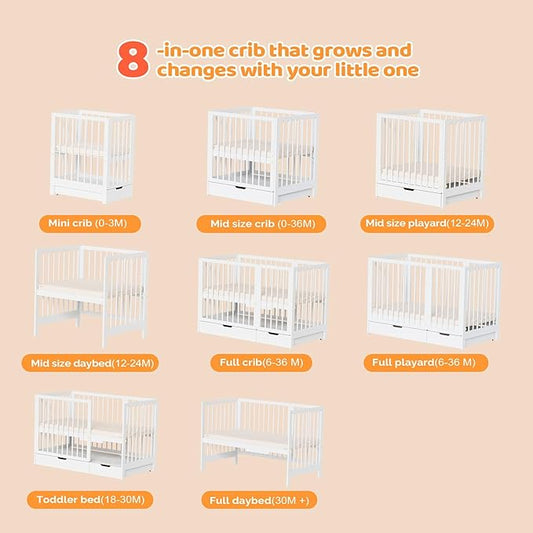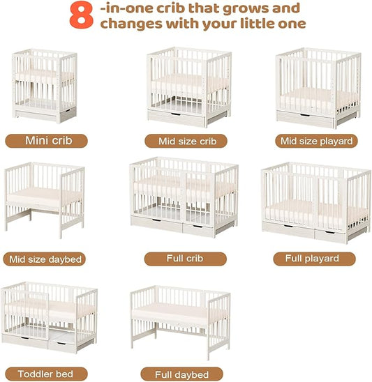 JOYMOR 8 in 1 Convertible Crib with Changer, Include 2” Mattress, Converts to Bassinet, Mid Crib, Full Size Crib, Daybed,Toddler Bed and Playard (Crib with Drawer, White)