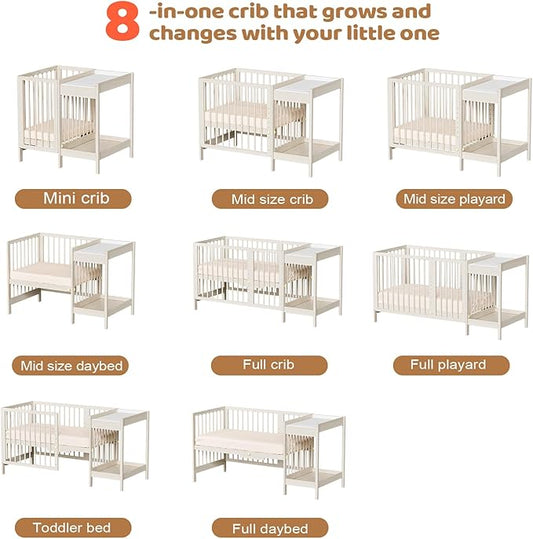 JOYMOR 8 in 1 Convertible Crib with Changer, Include 2” Mattress, Converts to Bassinet, Mid Crib, Full Size Crib, Daybed,Toddler Bed and Playard (Crib with Changer, White)