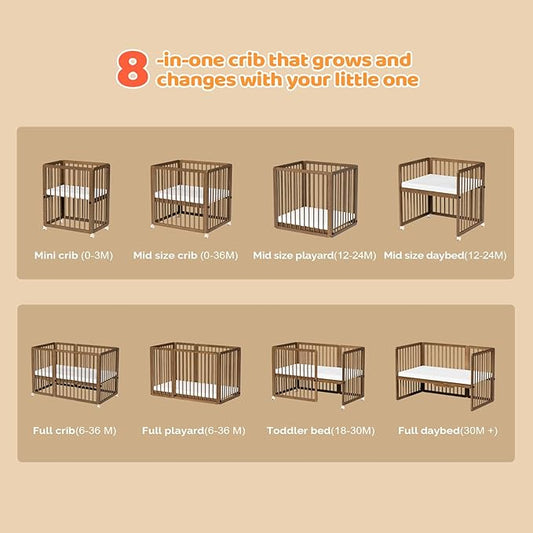 JOYMOR 8 in 1 Convertible Crib with Changer, Include 2” Mattress, Converts to Bassinet, Mid Crib, Full Size Crib, Daybed,Toddler Bed and Playard (Crib, Honey Wood)