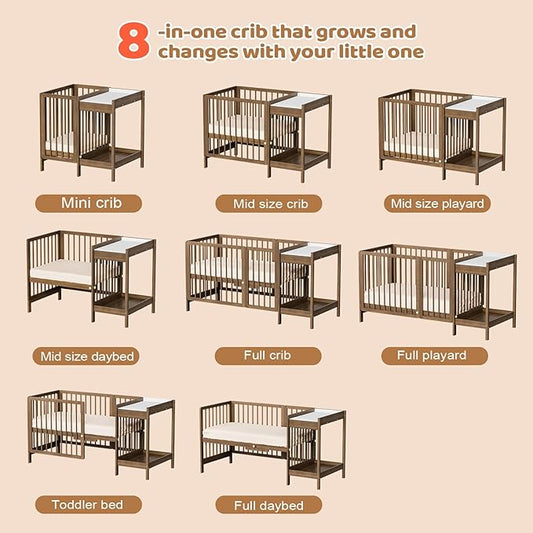 JOYMOR 8 in 1 Convertible Crib with Changer, Include 2” Mattress, Converts to Bassinet, Mid Crib, Full Size Crib, Daybed,Toddler Bed and Playard (Crib, Washed Natural)
