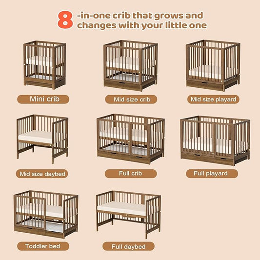 JOYMOR 8 in 1 Convertible Crib with Changer, Include 2” Mattress, Converts to Bassinet, Mid Crib, Full Size Crib, Daybed,Toddler Bed and Playard (Crib with Drawer, Washed Natural)