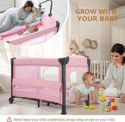 JOYMOR 4 in 1 Pack and Play, Baby Bedside Bassinet, Sturdy Play Yard with Padded Mat and Toy bar with Soft Toys