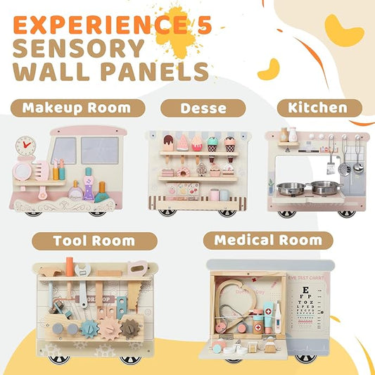 JOYMOR Wooden Train Wall Busy Board Activity, Sensory Wall Panel for Kids, Toddler Montessori Learning Activity Center for Playroom,Daycare, Ideal Educational Gift