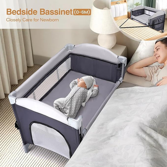 JOYMOR Pack and Play with Changing Table, 5-in-1 Portable Baby Bedside Bassinet with Storage, Travel Crib with Carry Bag, Compact Fold (Gray)