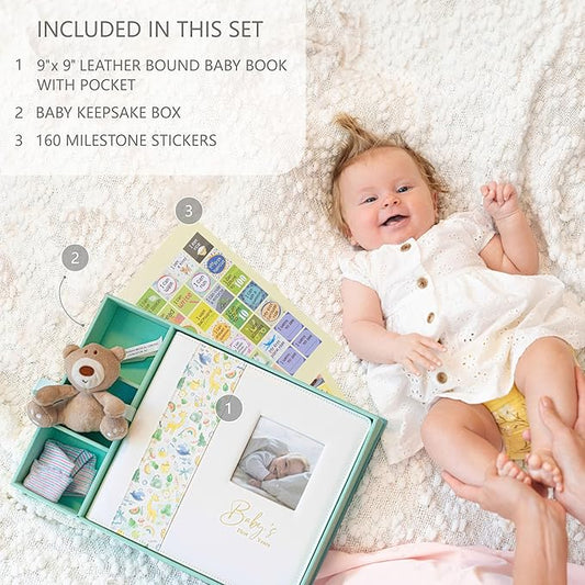 Keepsake Baby Memory Book with Keepsake Box Girl Boy - Timeless Leather-Bound Baby Milestone Book | Baby Book Keepsake and Baby Photo Memory Box to Record Baby Shower to Age 5 - Beautiful Gift