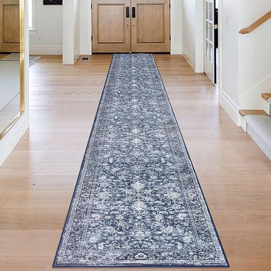 KILOCOCO Hallway Runner 2.6x18 Rug Runner Printed Vintage Floral Washable Kitchen Runners Non-Slip Rubber Backed Runners for Hallways Laundry Room Distressed Boho Rugs for Bedroom, Blue