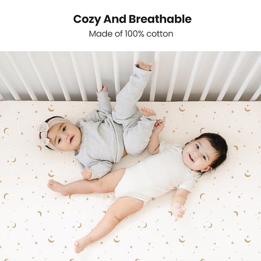 Konssy Muslin Crib Sheets for Girl Boy, 2 PCS Soft and Breathable Cotton Baby Sheets for Standard Crib Mattress, 52"x 28" (Moon,Camel)