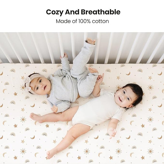 Konssy Muslin Crib Sheets for Boys, Soft Cotton Neutral Baby Sheets for Standard Crib Mattress 2 Pack, 52"x28" (Camel, Sun)