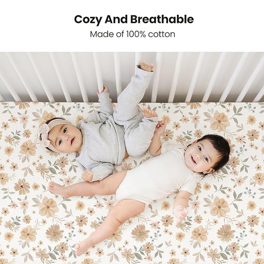 Konssy Muslin Crib Sheets 2 PCS 100% Cotton Baby Crib Sheets for Standard Crib Mattress (28" x 52"), Soft and Breathable for Boys, Girls (Toffee, Flourish)