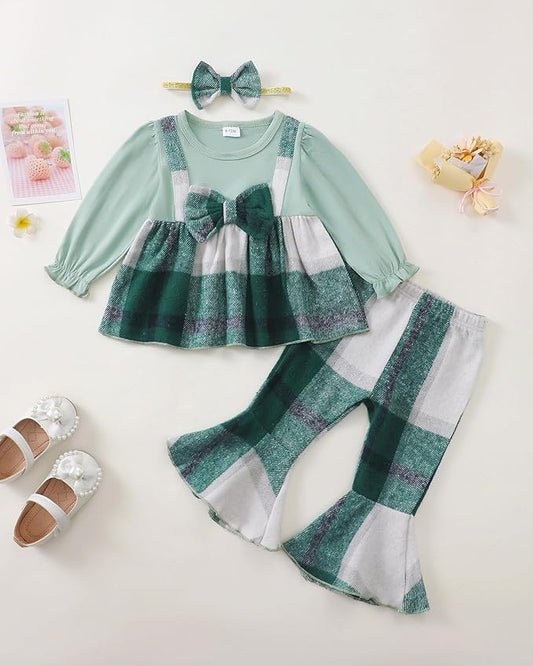 Kucnuzki Toddler Baby Girl Clothes Outfit Long Sleeve Plaid T Shirt Top Flare Leggings Pants 2 Piece Outfit Kids Clothes
