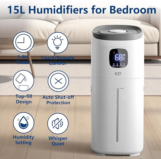 KZF 15L Humidifiers for Bedroom Large Room - 2000 Sq.ft Coverage, 72Hrs Runtime, Top Fill, 26dB Quiet, 3 Mist Levels & Diffuser, Auto Shut-Off, Ready for Baby Nursery and Plants