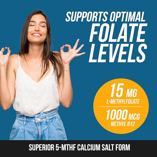 L Methyl Folate 15mg Plus Methyl B12 Cofactor – High Potency, Active 5-MTHF Form - Supports Mood, Methylation, Cognition – Bioactive Forms of Vitamin B9 & B12 (60 Capsules – 60 Servings)