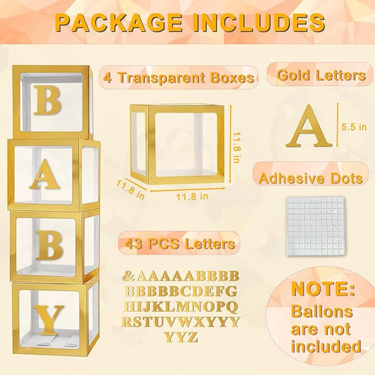 Ledido Gold Baby Boxes with Letters for Baby Shower, 4Pcs Clear Balloon Boxes with 43 Letters for Gender Reveal Birthday Wedding Baby Shower Decorations