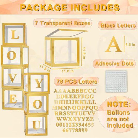 Ledido Gold Transparent Balloon Boxes with 78 Letters, Baby Boxes with Letters for Baby Shower Clear Letter Boxes for Party Graduation Wedding Birthday Baby Shower Decorations 7 PCS