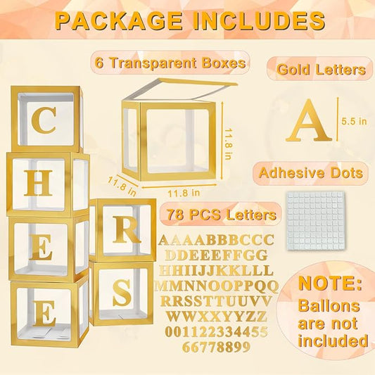 Ledido Gold Transparent Balloon Boxes with 78 Letters, Baby Boxes with Letters for Baby Shower Clear Letter Boxes for Party Graduation Wedding Birthday Baby Shower Decorations 6 PCS