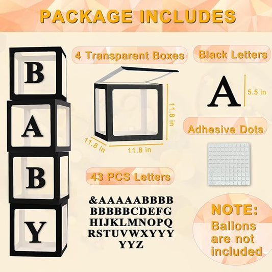 Ledido Baby Boxes with Letters, Clear Balloon Boxes for Baby Shower, Black Transparent Block Babyboy Letter Boxes for Birthday Bridal Wedding Graduation Prom Party Gender Reveal Party Decor, 4 PCS
