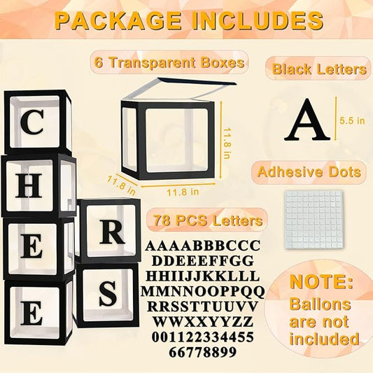 Ledido Black Transparent Balloon Boxes With 78 Letters, Letter Box for Baby Shower Clear Baby Box Black Balloon Boxes for Birthday, Bridal Shower, Graduation Prom Party Decoration, 6 PCS