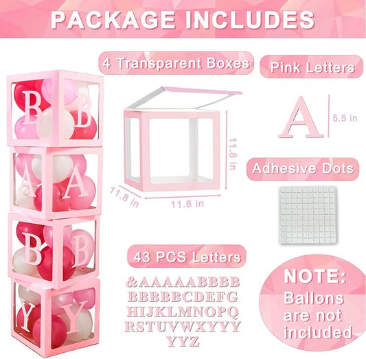 Ledido Baby Boxes with Letters for Baby Shower, Pink Clear Balloon Boxes with 43 Letters for Gender Reveal Wedding Birthday Party Decorations 4PCS