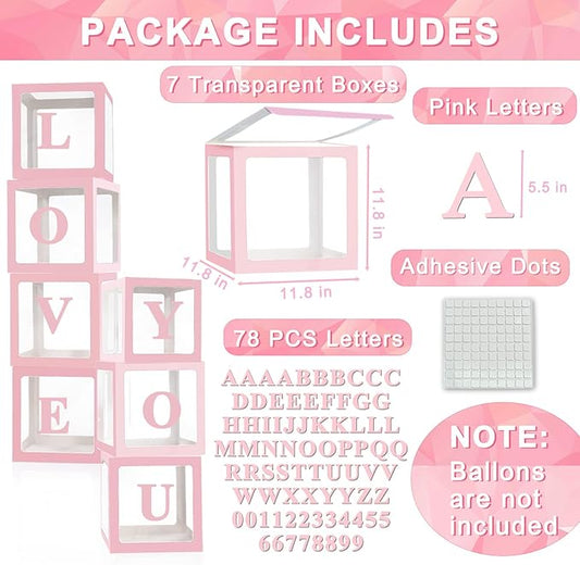 Ledido Transparent Balloon Boxes With 78 Letters, Pink Baby Boxes with Letters for Baby Shower Clear Letter Boxes for Party Wedding Birthday Baby Shower Decorations 7 PCS