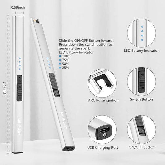 Lighter Electric Candle Lighter Long Electronic Rechargeable USB Arc Windproof Flameless Lighters for Candle Camping BBQ Birthday Women's Day Gifts for Women Mom Wife Men, Silver