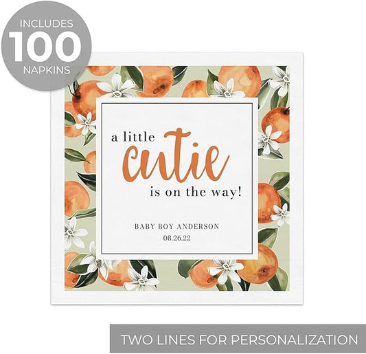 Little Cutie Personalized Baby Shower Napkins / 100 Clementine 4 3/4" x 4 3/4" Beverage Napkins/Gender Neutral Baby Citrus Party Napkins/Made In The USA